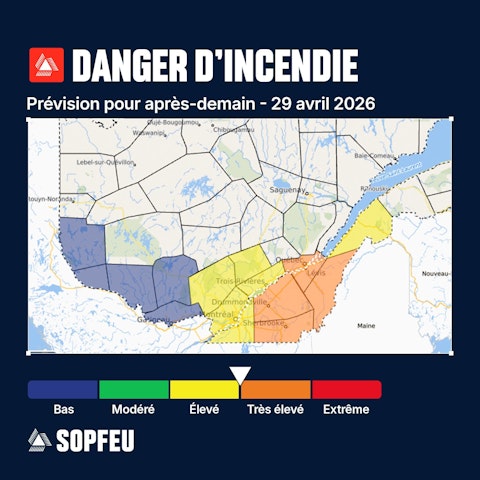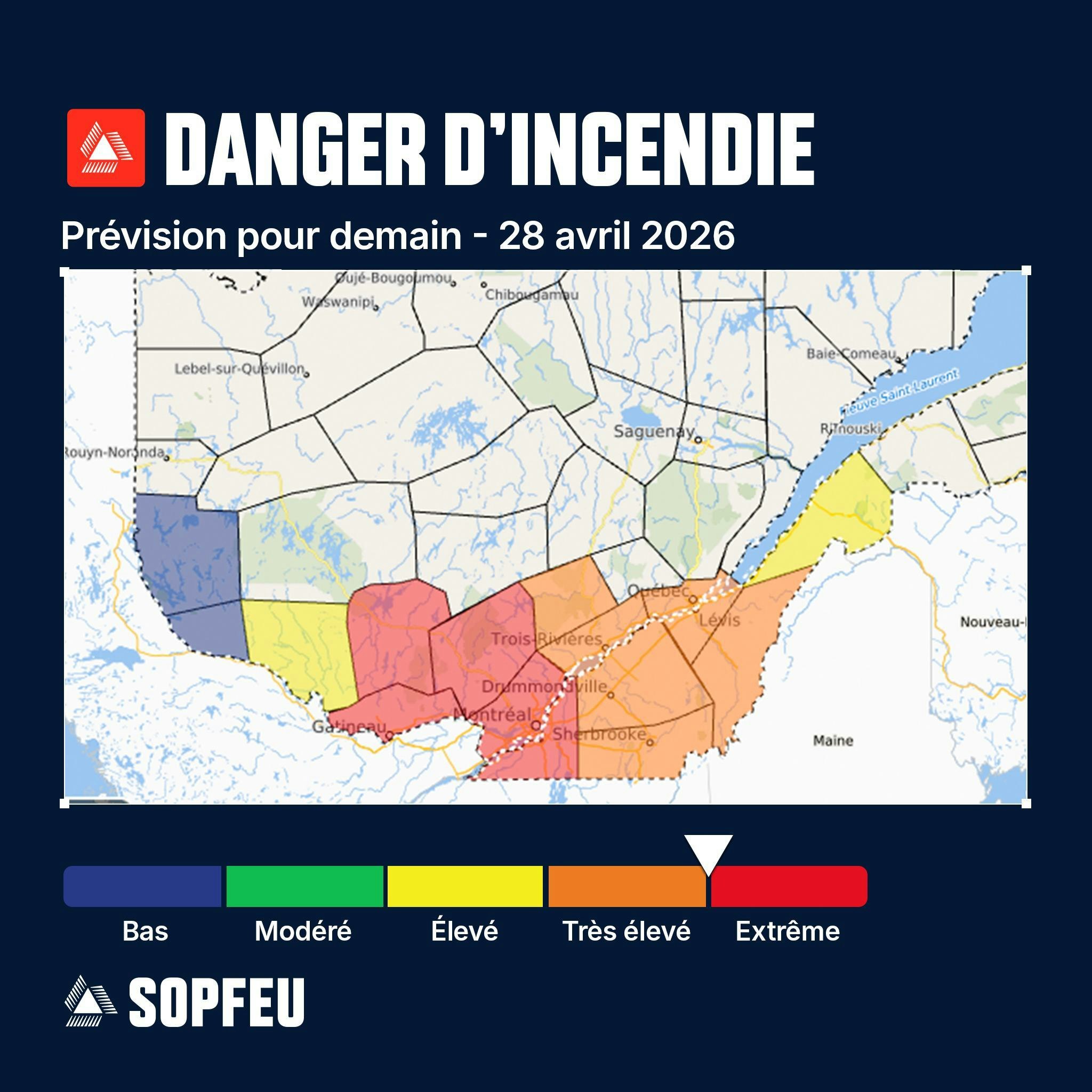 Ville de Rigaud, le lundi 27 avril 2026 - Selon la carte de la SOPFEU, l'indice de danger d’incendie dans Vaudreuil-Soulanges est EXTRÊME.